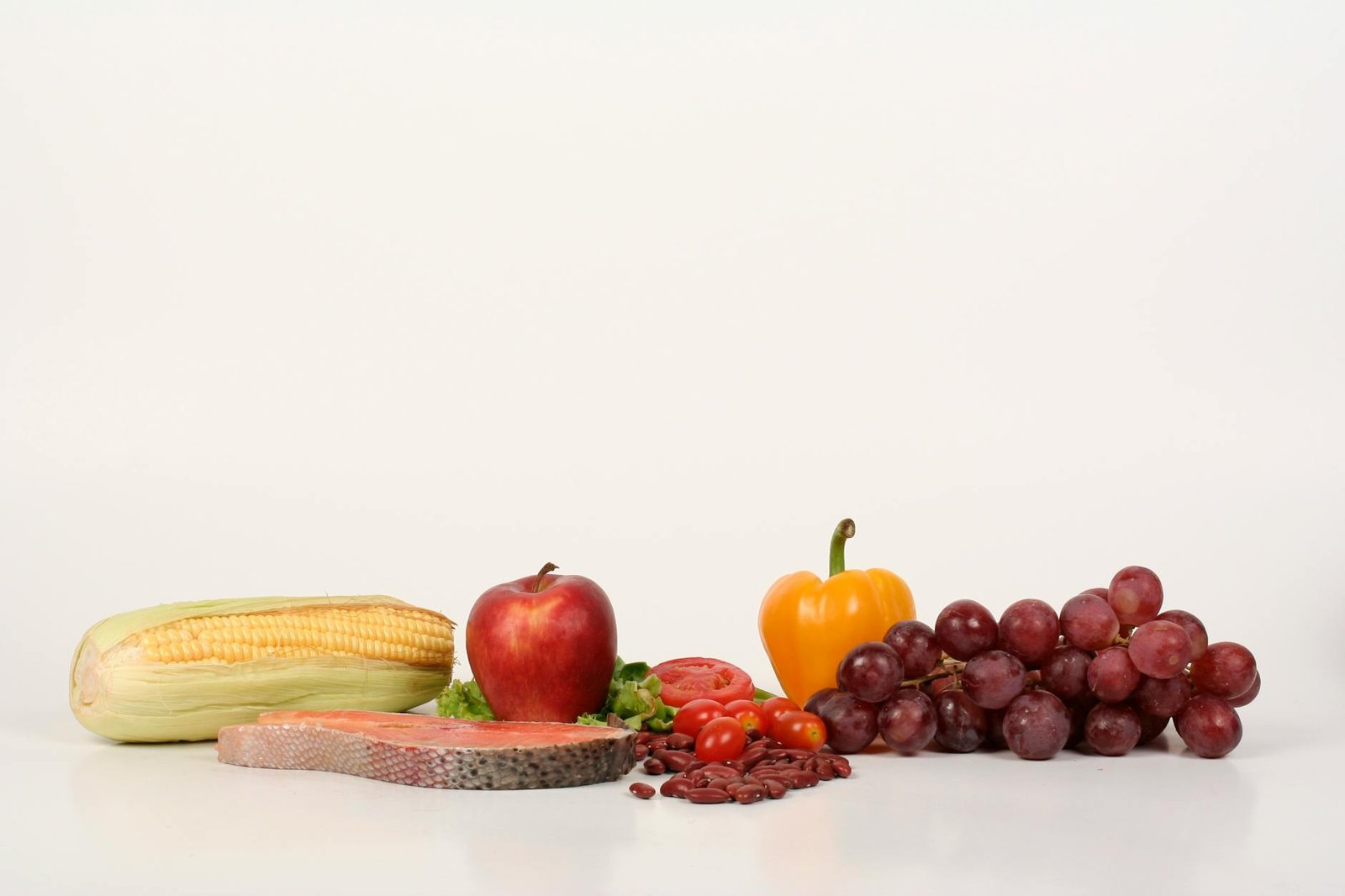 Vibrant display of fruits, vegetables, and salmon on a white background, ideal for food and health themes.